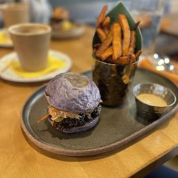 Food is delicious and creative. I've gone to both the cafe and the restaurant (for a tasting collective meal which was 5 courses). I'll have to try the restaurant again on an a la carte basis. Everything was gorgeous and tasty. Very thoughtful and creative cuisine. The lattes were ok though they sound amazing. Who wouldn't love rainbow sprinkles on coffee?! I wanted more pandan flavor but it got a bit overpowered by the espresso. The hot cake brûlée was insane. The ube butter is gorgeous and tasty. The hot cake itself is rich and satisfying. Paired with the berries is a decadent delight I'll certainly be back for. Service in the restaurant is friendly but spotty in the cafe. It's a bustling spot with high energy feel and cool spot for something different. Cafe has pretty tight seating but upstairs is more open.